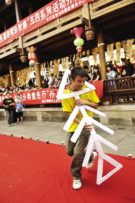 东南网5月4日讯(东南网记者谢添实)大学生们身上粘满各色塑料袋,