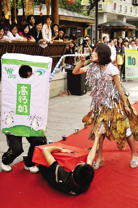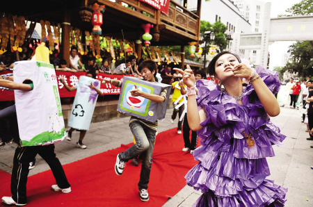 昨日下午,为了宣传“低碳”的环保理念,闽江学院中文系的100多位志愿者联合开展了这场“喜迎世博我响应垃圾分类我先行”的街头行为艺术活动。女生穿着由塑料袋、枯叶等废弃物改制成的时尚服装,或娇俏可爱或端庄大方,体现了“低碳”与时尚的结合;男生则装扮成各种“垃圾”,大耍炫酷街舞,给市民们带来极强的视觉冲击力。气氛达到高潮时,在场的同学们还跳了一段Nobody舞。 (东南快报记者陆乙鑫/图王进实习生高沁/文)