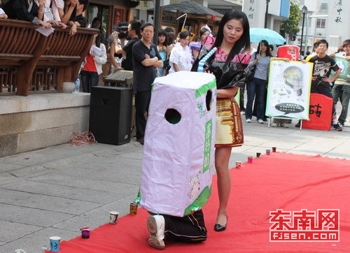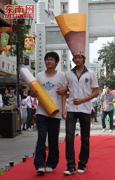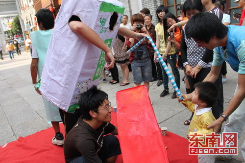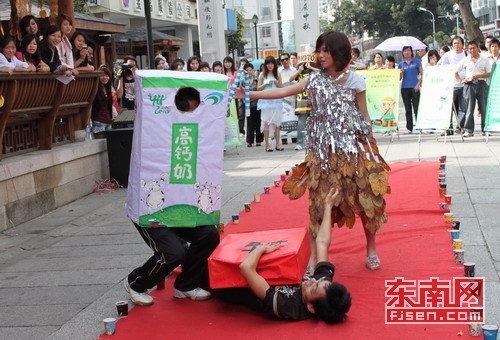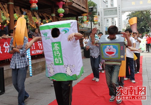 “香蕉皮”“牛奶盒”“废旧电池”在街上大跳街舞?这搞怪的一幕昨日下午便发生在福州南后街,只不过跳舞的“垃圾”全部是由人戴上道具头套装扮的。