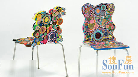 利用螺旋状的彩色圆状物做拼接,空隙部分用相同的材质填充,同时保留外沿的造型,极具视觉冲击力。由于椅背色彩缤纷、造型独特,因此受力部分只选用简单的金属结构。