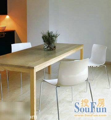 一个简约风格的餐厅搭配环保家具再合适不过了,经过精心处理的桌面呈现出木头的天然纹理,搭配简单的原色座椅,这个房间内的其他家具和装饰也都以直线条为主,看上去干净利索,尽显简约之风。