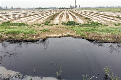 ——滹沱河是海河流域的重点河流,流经石家庄、衡水等地。在藁城、无极交界处,河沟里污水颜色如墨汁,沟边土壤被染成深黑色,气味异常刺鼻。附近一个正在浇地的村民说,有时候抽上来的水是黄花带绿沫的,能把庄稼浇死。