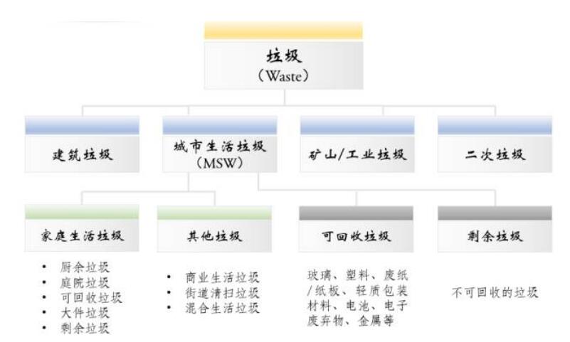 按照后续处理方式,生活垃圾又可分为分类收集的垃圾和剩余垃圾两类。分类收集的垃圾包括废纸、有机垃圾(残余果蔬、园林垃圾等)、玻璃(分为棕色、绿色、白色)、轻质包装废弃物、大件垃圾(废旧家具)及废旧金属、废旧电池等多种类型。剩余垃圾则是其它不可回收的残余废弃物。