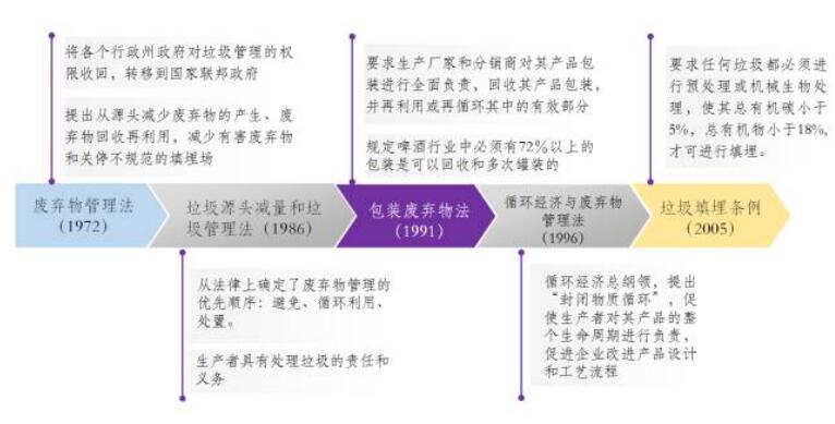 1991年颁布的《包装废弃物法》将包装废弃物的收集和处理责任从过去的各个行政州政府分摊给了各生产厂家、分销商等企业机构,要求生产厂家和分销商回收其产品包装,并进行再利用,该法催生了德国著名的“二元回收系统”(即“绿点公司”),与公共环卫回收系统平行运作。