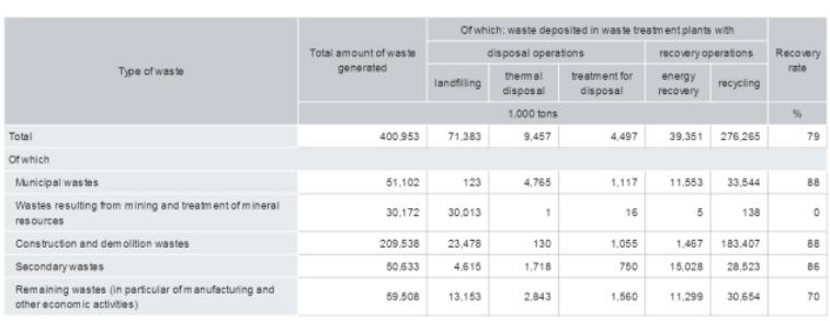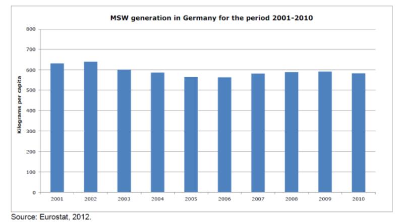根据欧洲统计局的数据,从2001年至2010年,德国的城市生活垃圾总产生量在5000万吨左右浮动,但是人均垃圾产生量有所下降,从2001年的632kg/a(1.73kg/d)减少到2006年的564kg/a(1.55kg/d)。