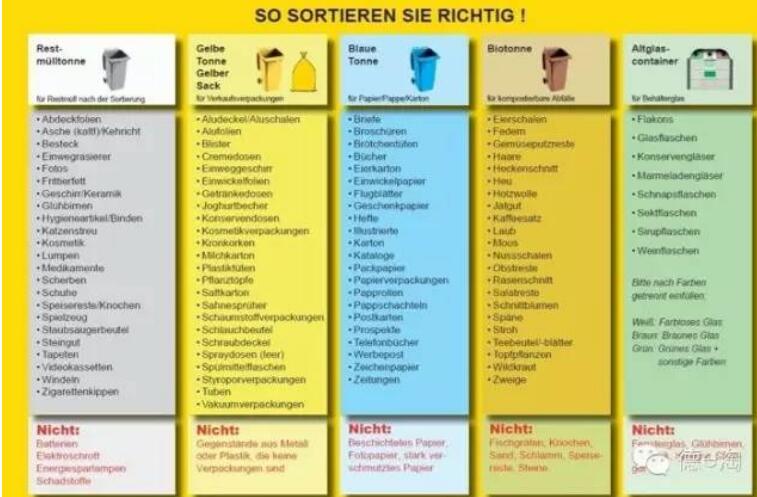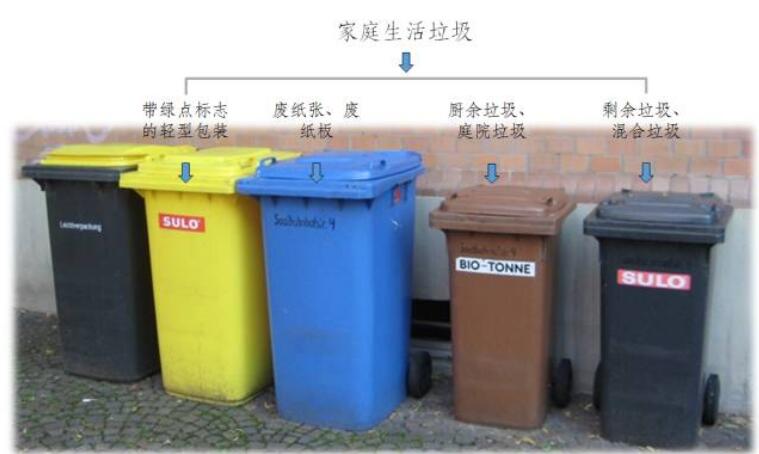 德国生活垃圾分类多采用“五分法”,即将生活垃圾分为以下五大类分别扔入不同颜色垃圾桶:棕色桶装有机垃圾(包括剩饭剩菜、果皮骨头等厨余垃圾,庭院绿化垃圾);黄色桶(或袋)装轻型包装(如塑料袋,包装盒,牛奶盒等);蓝色桶收集废纸与废纸箱;废玻璃经过分类后分别投入棕色、白色、绿色三种颜色的垃圾桶;剩余黑色或灰色的桶,用来收集所有居民分到无法再分的剩余垃圾。