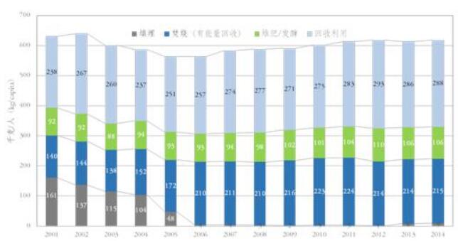 图:2001-2014年德国城市生活垃圾处理量(按不同方式)