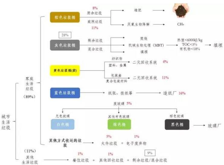 为了总结德国的垃圾都去哪儿了,小编根据德国联邦统计局2012年公布的数据画了以上示意图,来反映德国垃圾分类情况及流向。百分数表示2012年各类生活垃圾占德国城市生活垃圾总量的百分比。其中,红色百分数表示回收利用的百分比,其总和63%则为2012年德国的城市生活垃圾回收利用率。