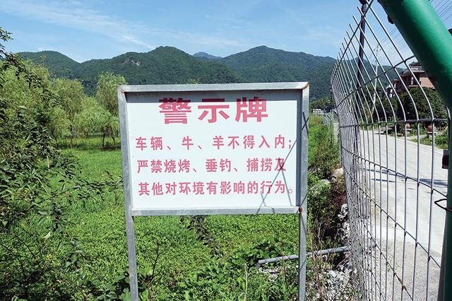 标志牌后面是防护栏,围住了郁郁葱葱的草木,防护栏设有开口,可让人入内观赏,不过内部立着警示牌:车辆、牛、羊不得入内;严禁烧烤、垂钓、捕捞及其他对环境有影响的行为。透过草木深处瞥见的是清清溪流。