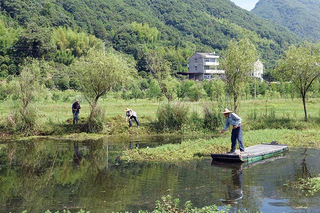 图:瑞岩溪湿地中,3位长者正在打捞水中植物,他们受聘每天工作8小时,对水域进行清理维护